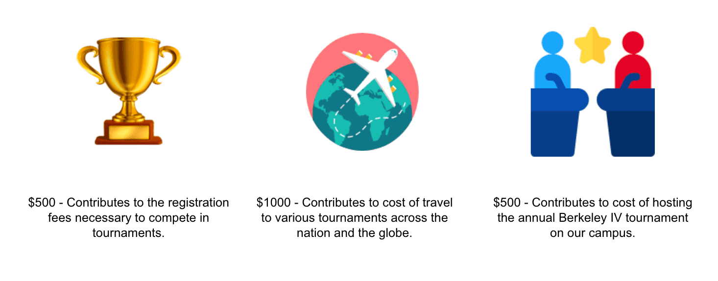 In order to maintain and improve our position and continue representing UC Berkeley on the international debate circuit, we hope to send students to the most competitive tournaments around the world. While the competition is fierce, the greatest challenge our students face is not strong opponents but rather having to personally pay for expensive flights. This fall, we will send five teams and four judges to represent our school in the 2024 United States University Debate Championships in Geneva, NY. We hope to continue to be able to represent UC Berkeley in the tournaments nationally and globally. However, travel, housing, and registration costs severely limit the number of students we can send to any tournament, especially ones on the other side of the globe. Your donation would make it possible to keep up and excel against the competition.