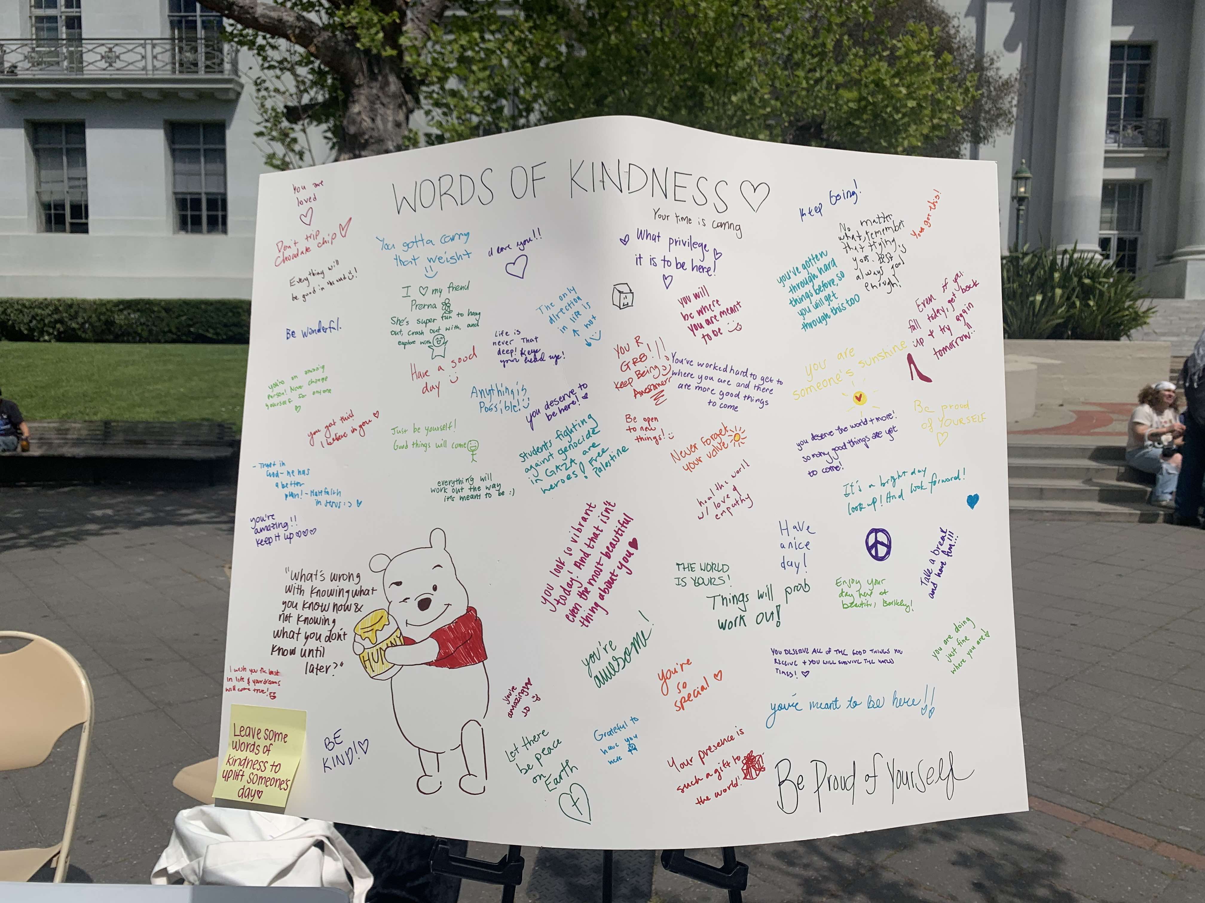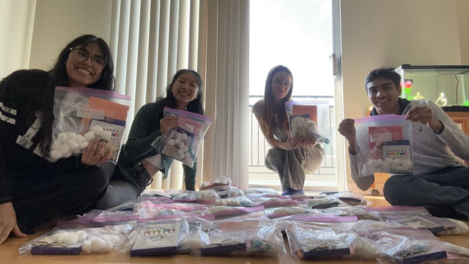 Making Care Packages for Underserved Communities!As for our efforts on campus, the initial premise was to host events, which we called Campus Compassion, to cultivate a culture of kindness on campus. We hosted five interactive events throughout the course of the semester: handing out over 450 sticky notes with hand-written words of affirmation through tabling, setting up bracelet-making and postcard printmaking stations on Upper Sproul, and more. We even established a partnership with the UC Berkeley Student Union to collaborate with them on events for the campus community: hosting a slime-making station at their semesterly DeStress Fest last spring and collaborating for their Student Parent Month Event this fall. This year, we hope to continue growing our impact on campus through more events, such as giving out wellness kits, setting up stations for bouquet-making, writing letters, and collaborating with other campus organizations.