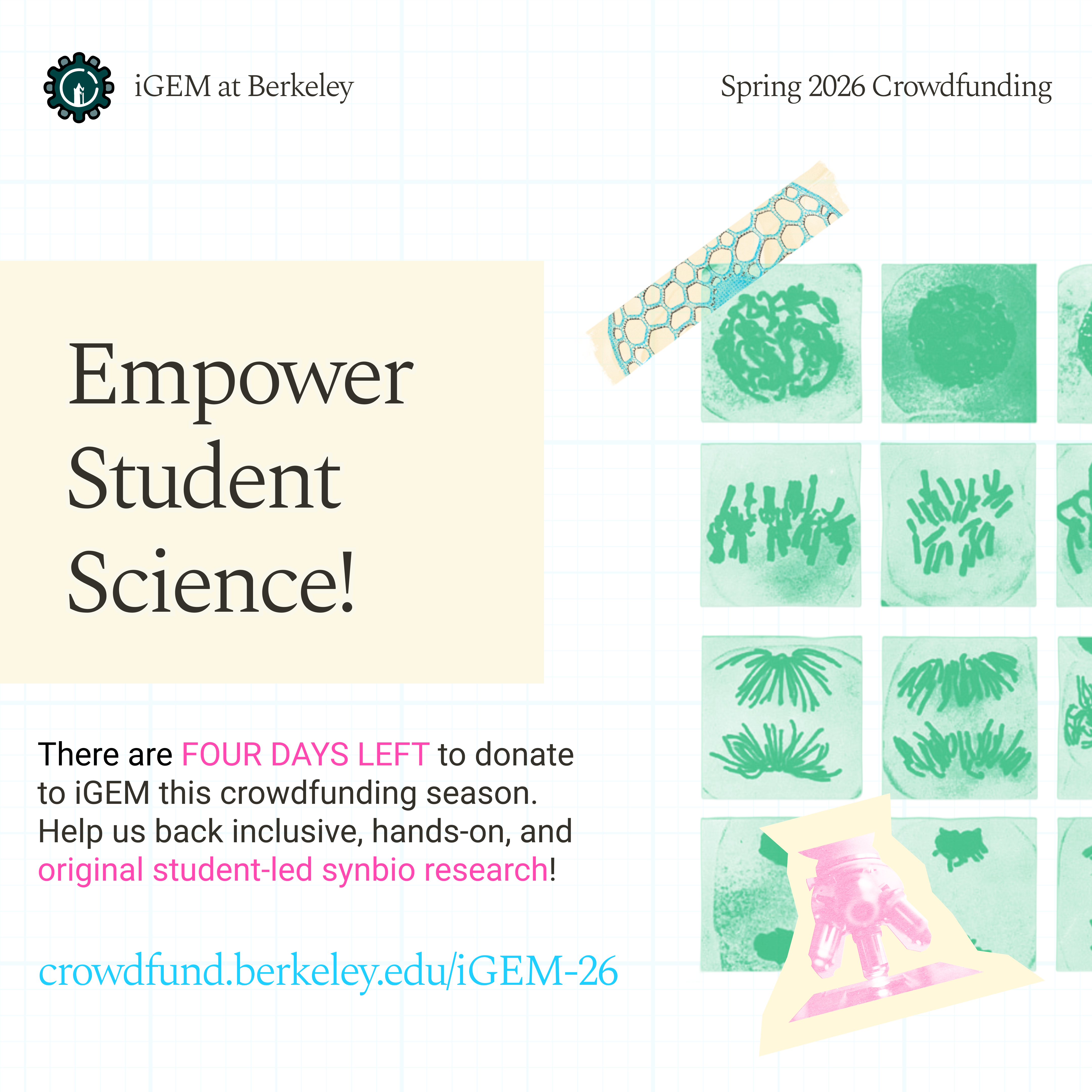 iGEM has 3 DAYS left to raise $2,300 and reach our goal to help support our experimental project teams and engineering research biology course.